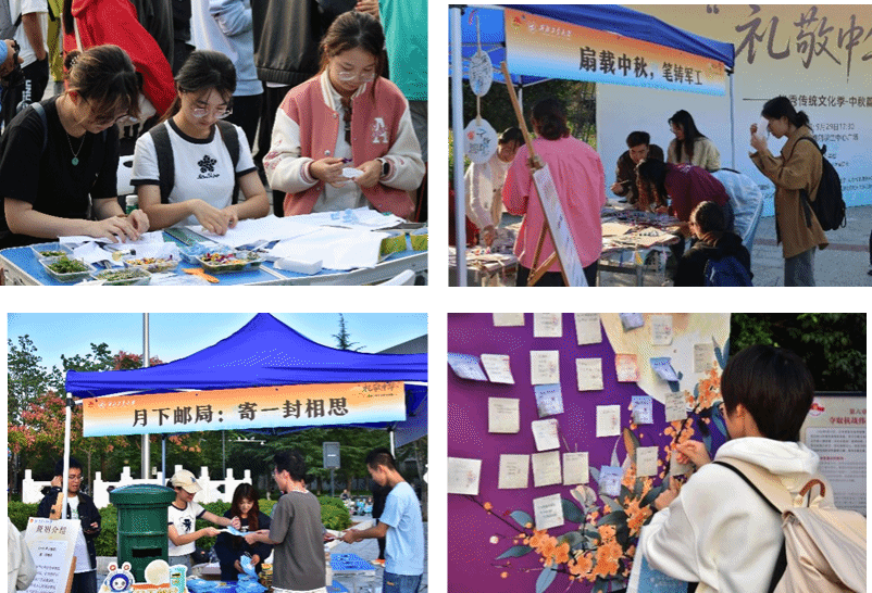 本次活动以“月下邮局,集章寄情”为主线,精心设置了十大传统文化体验区,象征十全十美、月满团圆之意。在“指尖绘秋,丹青映月”区域,同学们通过钻石画、团扇绘制等形式表达佳节祝福;“巧手制月,甜蜜团圆”活动现场,师生亲手制作月饼,体验中华传统饮食文化的魅力;“同心运月,协力归途”等互动游戏增强了参与者之间的协作与交流;“月满金环,圈住好运”“拜月祈福,愿满金秋”等项目融民俗与趣味于一体,吸引师生踊跃参与。活动还特别设置了“扇载中秋,笔铸军工”环节,将学校“三航”特色与中秋元素有机结合,展现出了西工大学子特有的文化情怀。