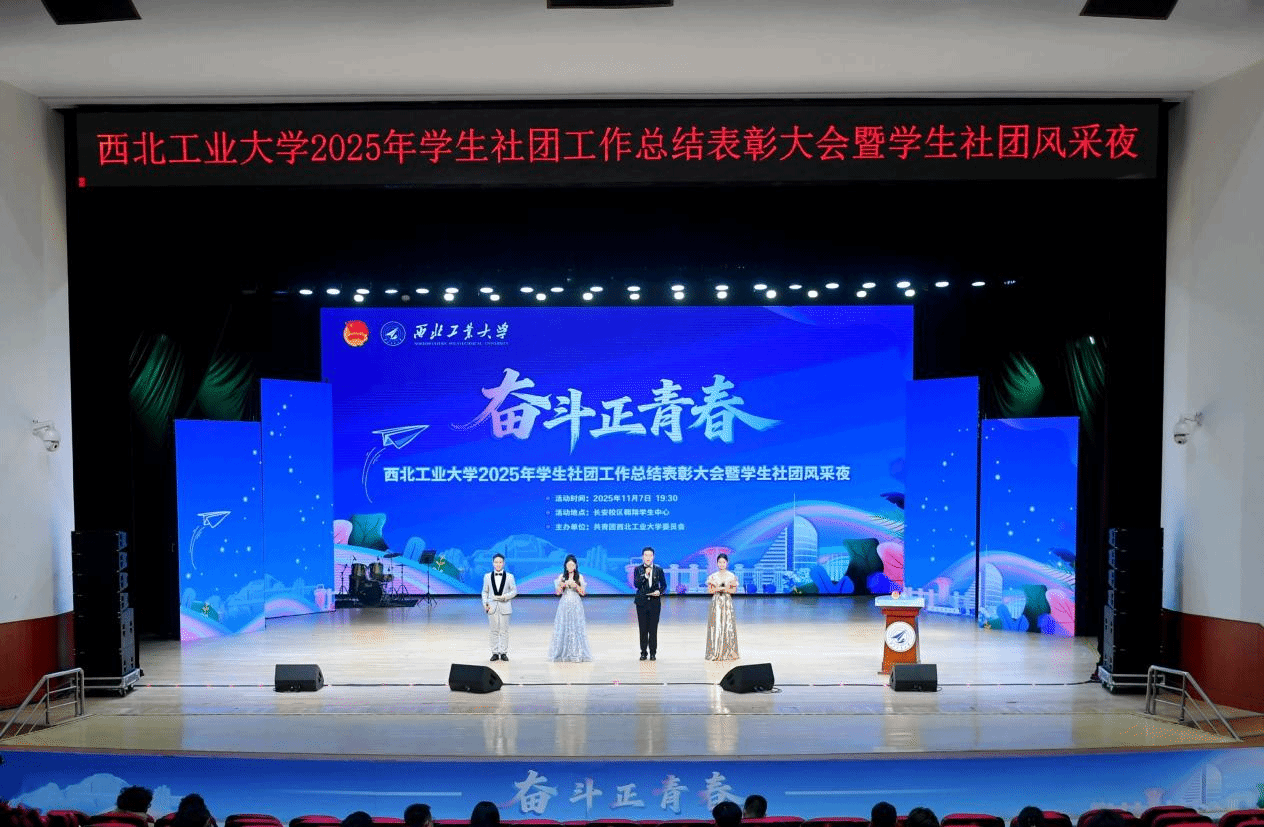 11月7日晚,由团委主办的西北工业大学2025年学生社团工作总结表彰大会暨学生社团风采夜在长安校区翱翔学生中心圆满落幕。校团委书记佘磊磊,党委学生工作部副部长、学生处副处长管峻,艺术教育中心副主任马玥,各学院、研究院团委书记,学生社团指导教师、学生代表参加了本次活动。