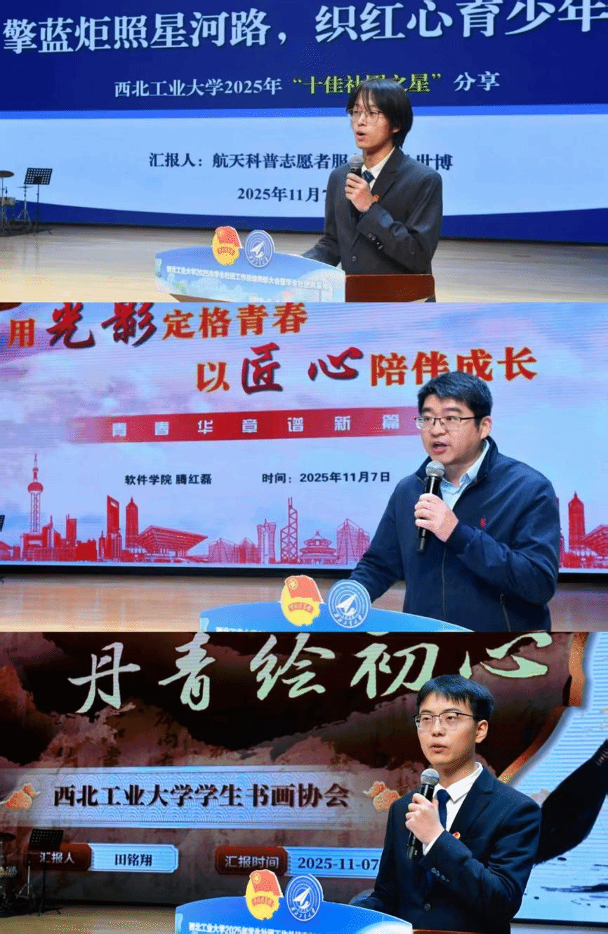 “十佳社团之星”代表、航空学院2023级本科生马世博以“擎蓝炬照星河路,织红心育少年星”为题进行分享。他将文昌发射场的震撼体验、渭南乡村小学的科普渴望与80余场志愿活动的星火进行串联,让“航天蓝”与“少年红”在科普实践中交相辉映。“十佳社团指导教师”代表、软件学院腾红磊老师以“用光影定格青春,以匠心陪伴成长”为题,表示将始终做学生成长的“专业快门”,让开展主题团日活动、发射塔追火箭实践等青春瞬间,精准聚焦在“为国铸剑、挺膺担当”的远大抱负中。“五星级学生社团”代表、学生书画协会会长田铭翔分享了“笔墨写天下,丹青绘初心”的七年坚守,从“书画周练小课堂”到“墨韵青春庆五四”三校联展,从山西壁画研学到为山区孩子写春联,协会以笔墨为媒,将思政温度融入非遗传承,让美育之花绽放在校园沃土上,连续七载蝉联五星荣耀。