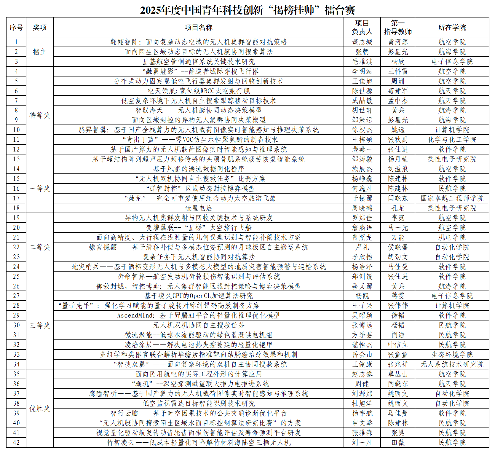 在2025年度中国青年科技创新“揭榜挂帅”擂台赛中,共42个项目获奖,其中,擂主(全国第一名)3项、特等奖10项、一等奖5项、二等奖7项、三等奖9项、优胜奖8项,创历史最好成绩;此前,在本届“挑战杯”竞赛2024年度“揭榜挂帅”专项赛中,我校共获得擂主1项、特等奖5项、一等奖11项、二等奖10项、三等奖5项。在本届“挑战杯”竞赛周期内,两年共计获得擂主4项、特等奖15项、一等奖16项、二等奖17项、三等奖14项、优胜奖8项。