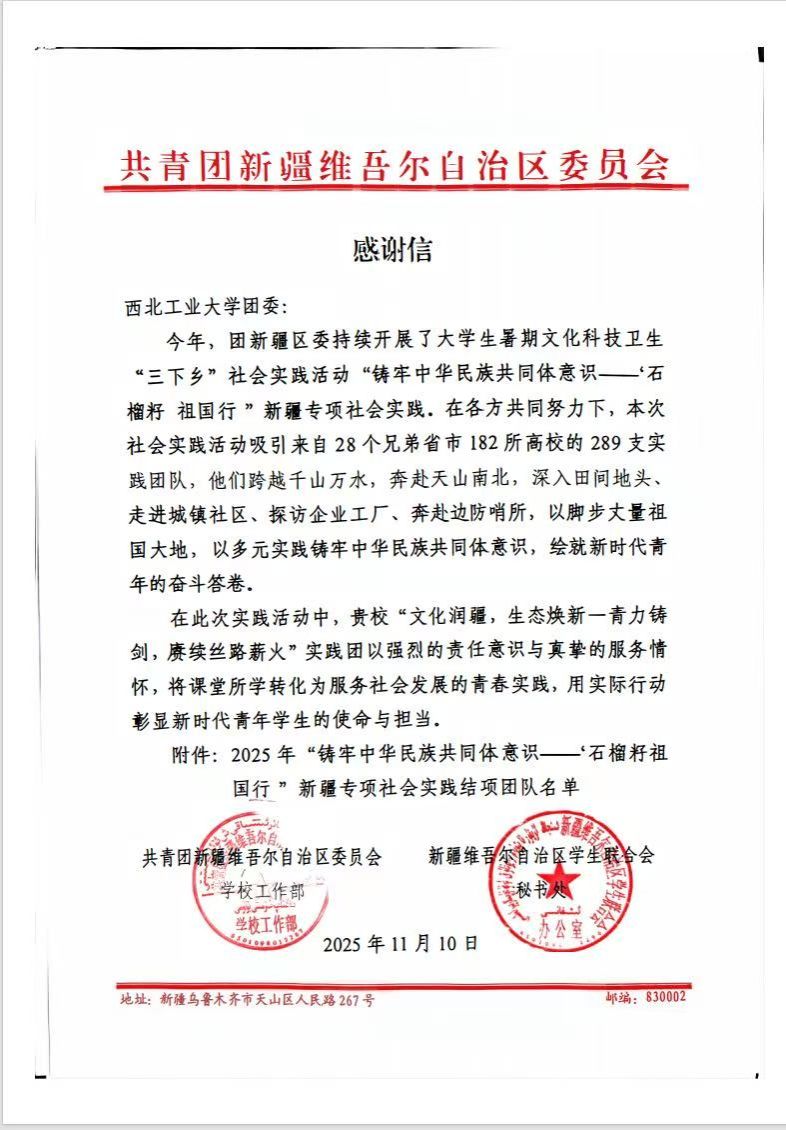 近日,共青团新疆维吾尔自治区委员会向我校发来感谢信,对我校“文化润疆,生态焕新——青力铸剑,赓续丝路薪火”实践队在2025年大学生暑期文化科技卫生“三下乡”社会实践“铸牢中华民族共同体意识——‘石榴籽 祖国行’”新疆专项活动中的突出表现与务实成效予以高度肯定,同时对学校长期深耕实践育人、引领青年学子主动服务国家战略的育人导向表示充分赞许。信中特别指出,我校实践队精准锚定专业所长与边疆发展需求的结合点,以实际行动生动诠释了新时代青年“强国有我、青春有为”的责任担当,为此次专项活动的高质量开展贡献了西工大青春力量。