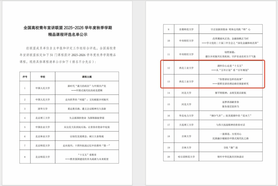 在全国高校青年宣讲联盟2025-2026学年秋季学期精品课程评选中,经单位申报与综合评定,工大青年宣讲团报送的《满怀信心走进“十五五”——从“五年计划”看“百年规划”》和《“你想讲好怎样的故事”——朋辈宣讲的理论路径探索研究》两门课程,成功获评全国精品课程。《满怀信心走进“十五五”——从“五年计划”看“百年规划”》从党的二十届四中全会入手,系统梳理我国“五年计划”的历史脉络与时代演变,并从“计划”到“规划”的战略转变出发,把握高质量发展的科学内涵。《“你想讲好怎样的故事”——朋辈宣讲的理论路径探索研究》则立足于“大思政课”建设背景,深入探讨大众传播与青年宣讲的融合创新,提出“知-识-行”三维备课法,为朋辈宣讲提供了可复制、可推广的实践经验。