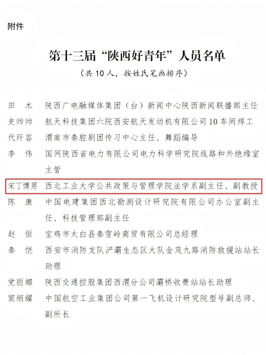 宋丁博男荣获第十三届“陕西好青年”称号