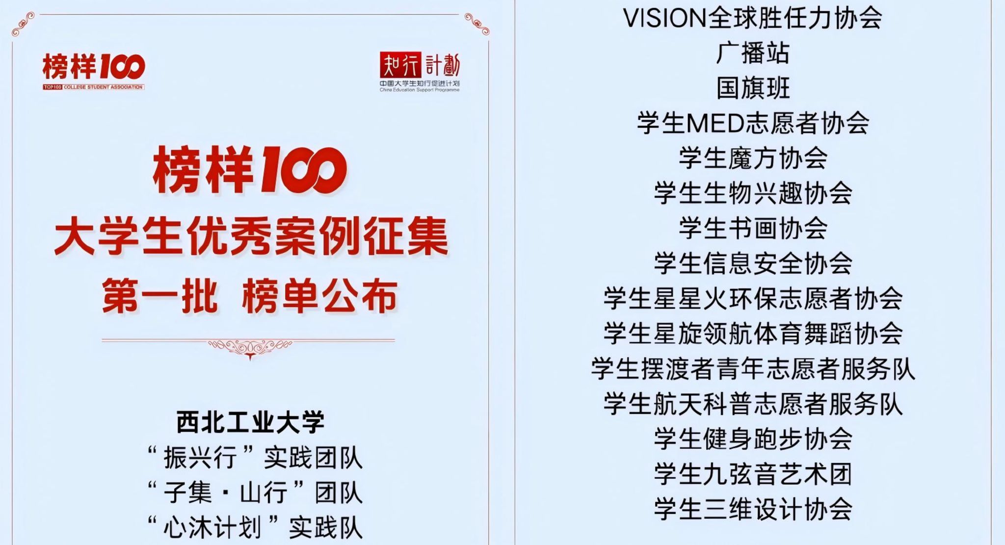 我校18个学生社团、学生组织实践案例获评2025全国“榜样100”大学生优秀案例,入选数量位居全国高校前列。