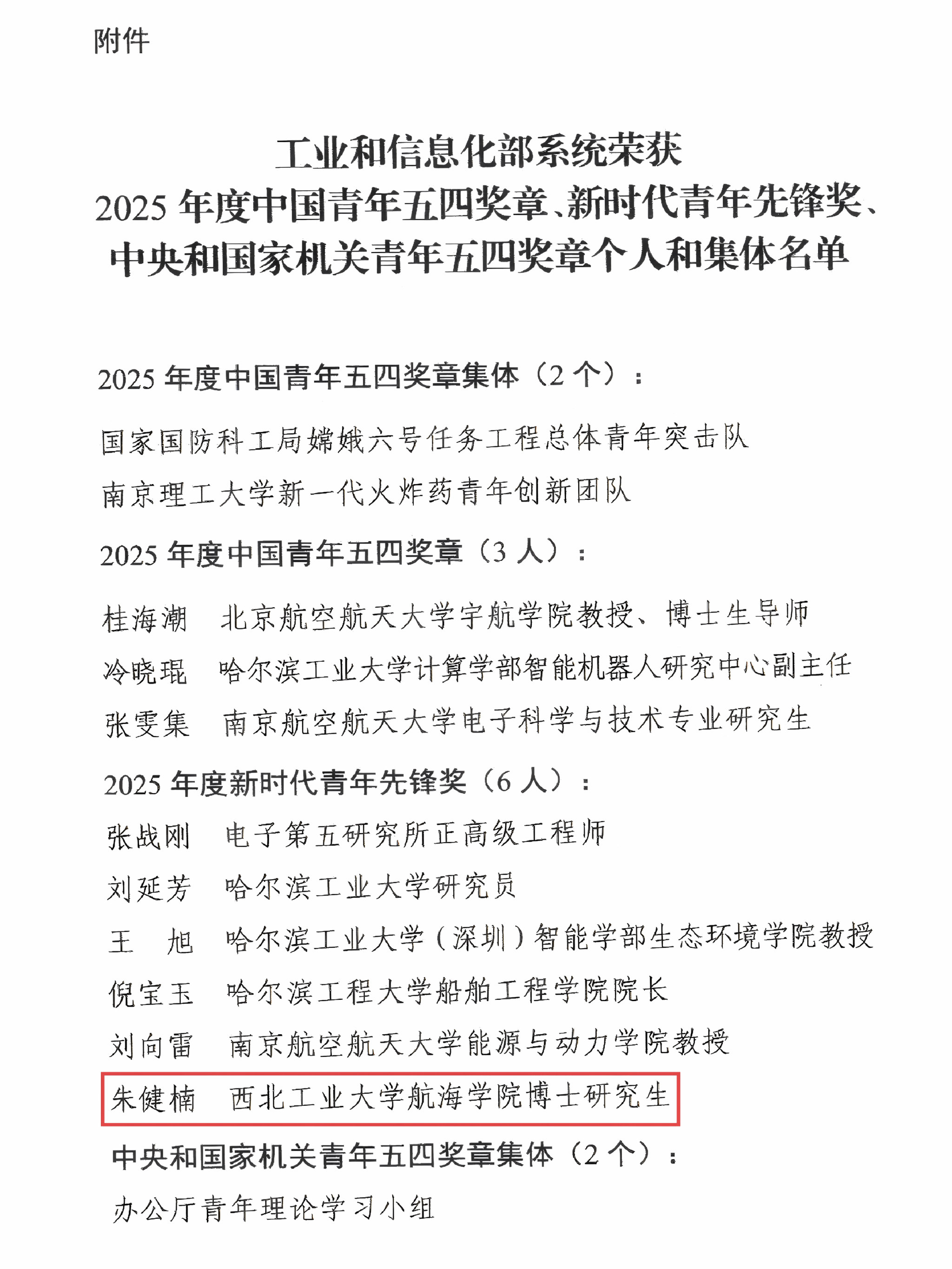 朱健楠荣获2025年度新时代青年先锋奖