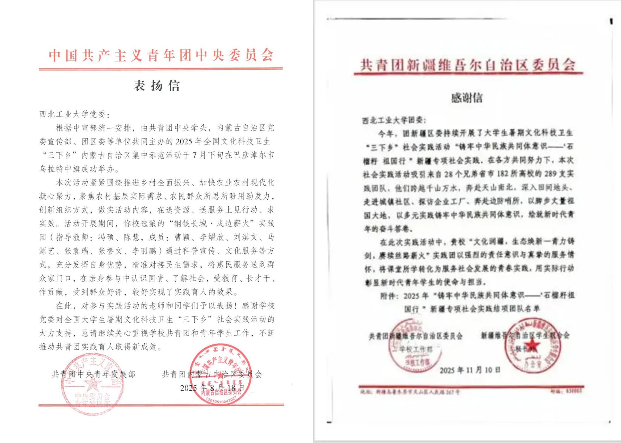 “文化润疆,生态焕新——青力铸剑,赓续丝路薪火”实践队成果获得新疆维吾尔自治区团委感谢信。