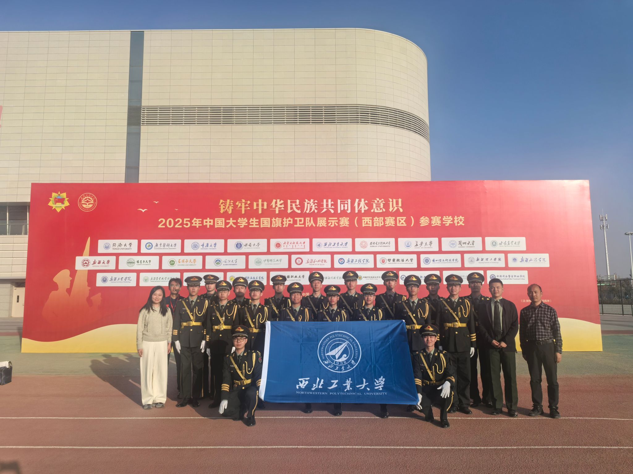 西北工业大学国旗班在2025年中国大学生国旗护卫队展示赛总决赛升旗展示项目中获得甲组男子三等奖(全国前8强)。